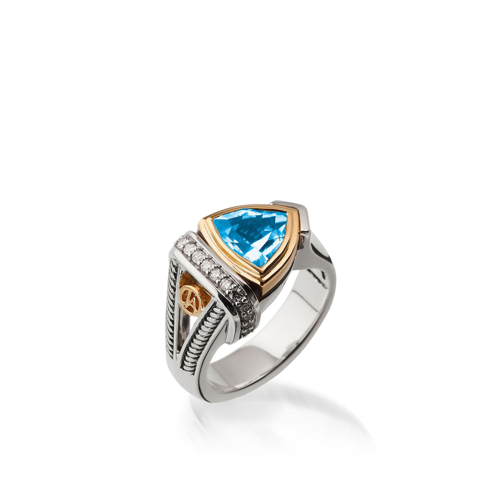 Arrive in style with this trillion and diamond sterling silver and 14 karat gold collection. Define your style with colorful trillion and diamond rich stacking bracelets, rings, pendant and earring styles.