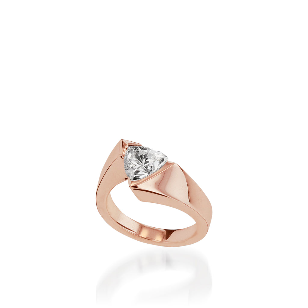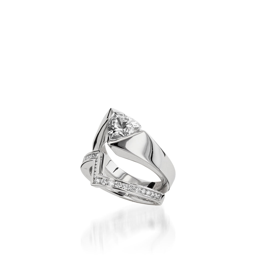 The return of Optica is a true Renaissance in design. First introduced years back, the trillion solitaire center, pristine 18 karat gold finish, and captivating architecture makes Optica a John Atencio classic. The Optica diamond wedding band gently tucks under the trillion center-stone as a symbol of love and commitment.
