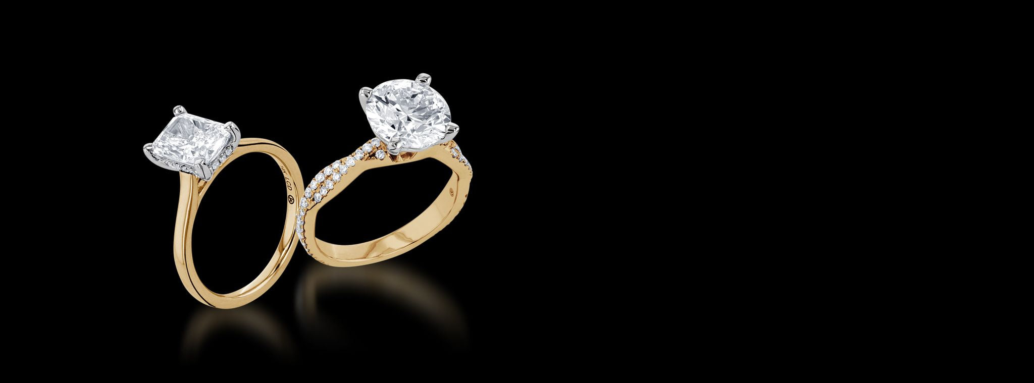 You can select from the most popular designs, including three-stone, halo, and vintage-inspired settings in yellow, white, and blush rose gold. There are many options to choose from, and each ring is available in your favorite gemstone shapes, including cushion, pear, oval, round, princess, emerald, and marquise.