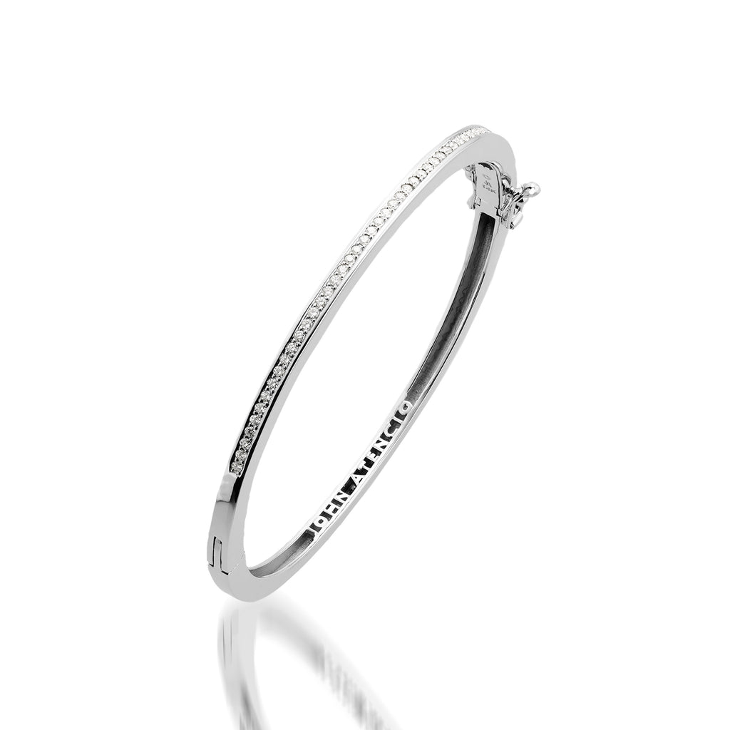 - Hinged bracelet measures 3mm wide, with safety clasp
